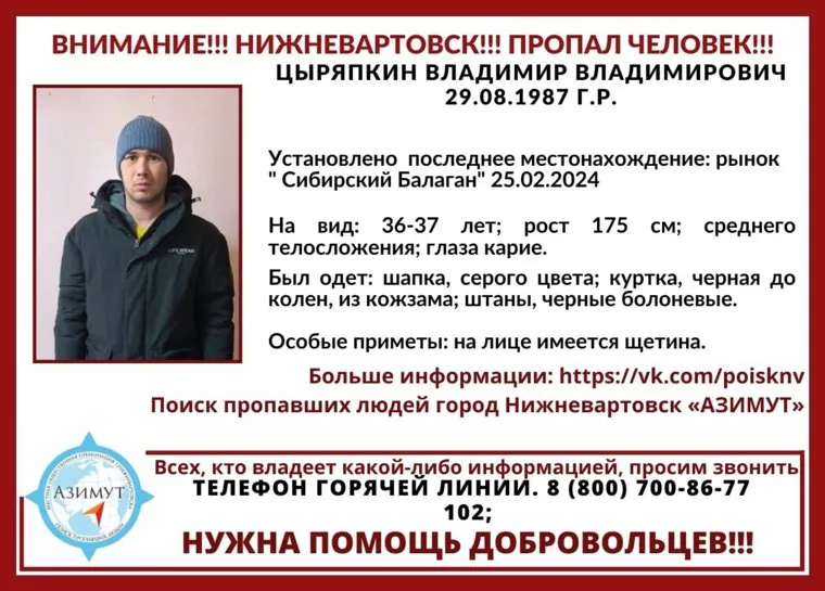 В Нижневартовске (ХМАО) пропал 36-летний Владимир Цыряпкин, которого перед исчезновением видели на рынке «Сибирский Балаган». Об этом сообщила группа поиска пропавших людей «Азимут».