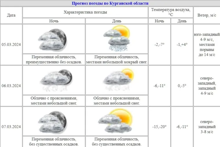 «Днем 5 марта в Курганской области будет от -1 до +4 градусов. Ожидается юго-западный ветер с порывами до 14 м/с, переменная облачность и небольшой мокрый снег. Ночью 6 марта будет от 6 до 11 градусов ниже нуля. Днем от 0 до -5. Весь день будет облачно с прояснениями, местами возможен небольшой снег при северо-западном и западном ветре 4-9 м/с. Ночью 7 марта вероятно похолодание до -20 градусов», — указано на сайте ЦГМС.