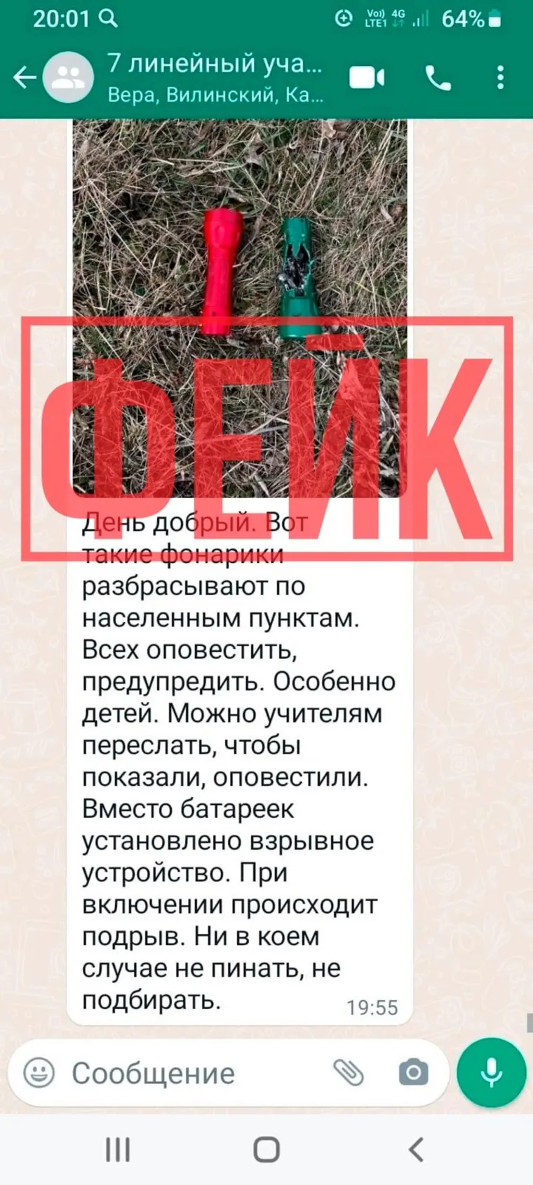 Жители разных регионов начали пересылать друг другу в мессенджерах и соцсетях панические сообщения о том, что в населенных пунктах возле школ якобы разбрасывают фонарики, у которых вместо батарейки установлена взрывчатка. Авторы постов просят максимально распространить информацию: «Вот такие фонарики разбрасывают по населенным пунктам, возле школ. Всех оповестить, предупредить. Особенно детей. Можно учителям переслать, чтобы показали, оповестили. Вместо батареек установлено взрывное устройство. При включении происходит подрыв. Ни в коем случае не пинать, не подбирать. Убить не убьет, но конечность разорвать может». Однако эта информация является фейком.