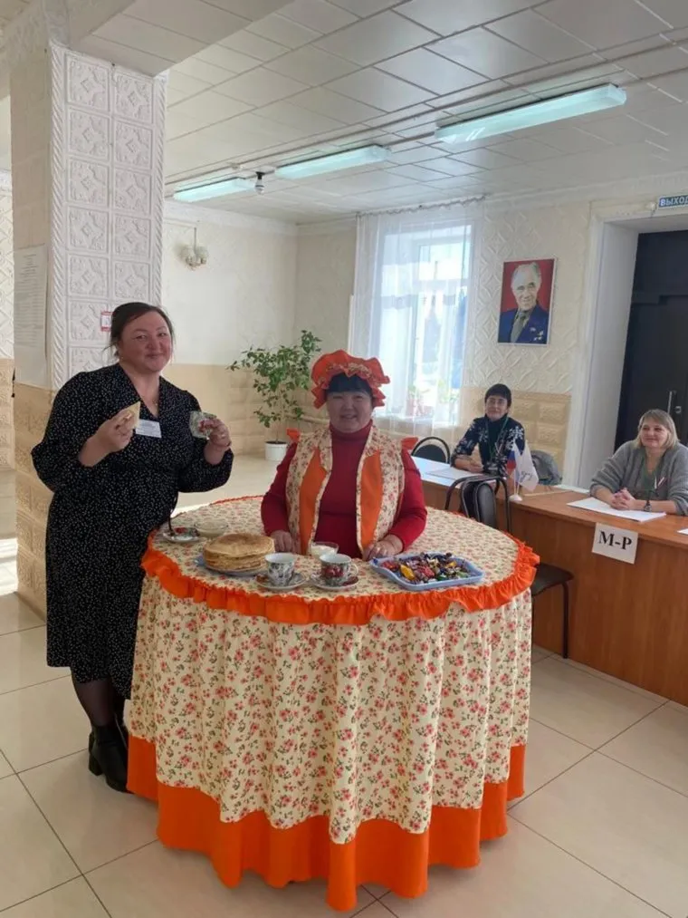 11:29 На избирательный участок в селе Мальцево пришла Масленица. Женщина оделась в костюм стола с угощениями — блинами и конфетами.