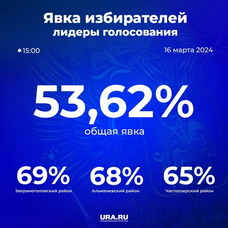 16:10 По данным на 15:00 16 марта, явка на выборах президента РФ составила 53,62% (более 342 тысяч избирателей). В лидерах Звериноголовский — 69%, Альменевский (68,01%) и Частоозерский (65,23%) округа. В Кургане на двух территориальных избирательных комиссиях явка составила 49,24% и 46,36%.