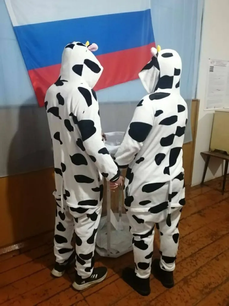 Молодая пара пришли голосовать в пижамах в деревне Украинец