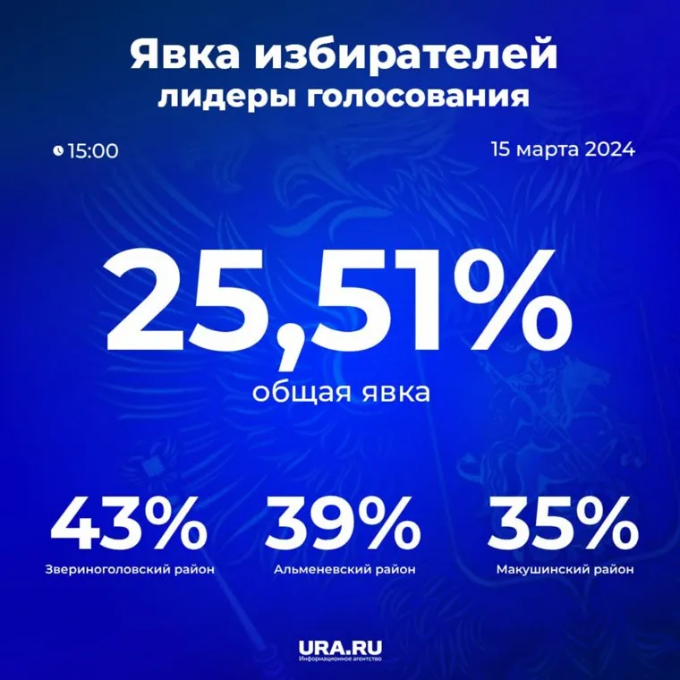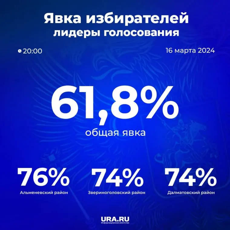 08:26 В первый день голосования наименьшая явка была зафиксирована в Кургане. По данным Восточной ТИК — 31.94%, по данным Западной ТИК — 35.38%. В Шадринске явка составила 36.52%. 15 марта было зафиксировано в Альменевском (49,84%), Далматовском (49,10%) и Макушинском (46,11%), Шатровском (46,96%) муниципальных округах.