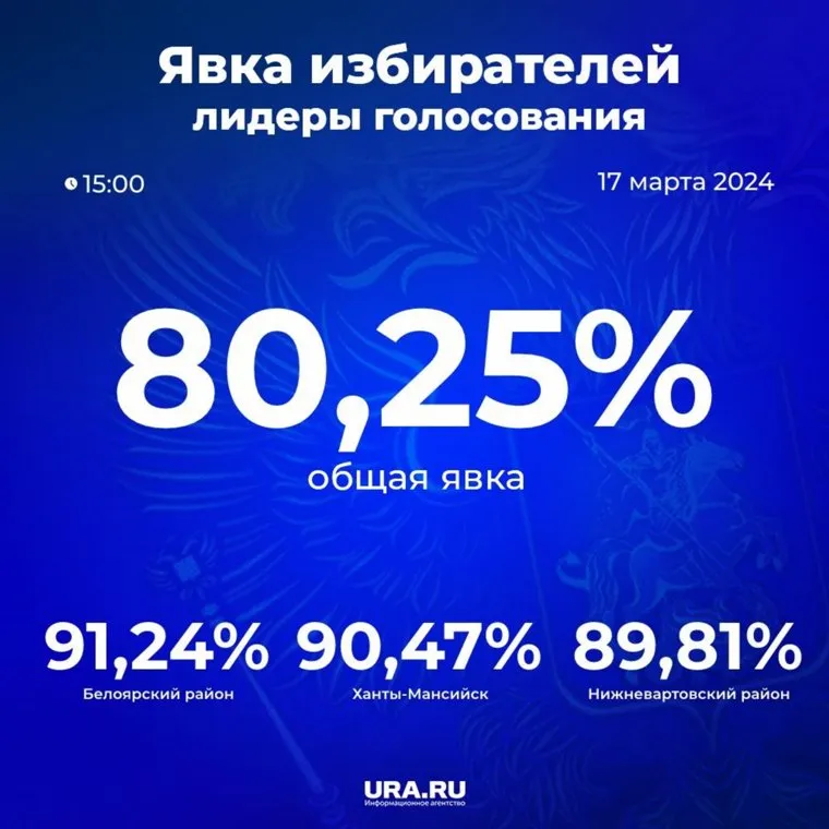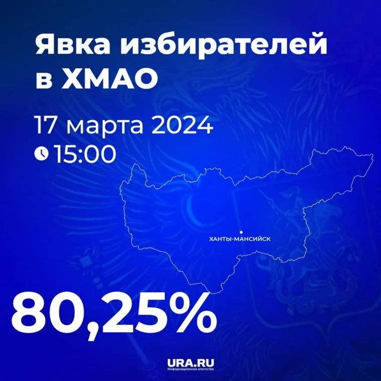 15:22 На выборах президента России проголосовали 80,25% югорчан, по состоянию на 15:00. Это 906 894 избирателей, говорится в telegram-канале окружного избиркома.