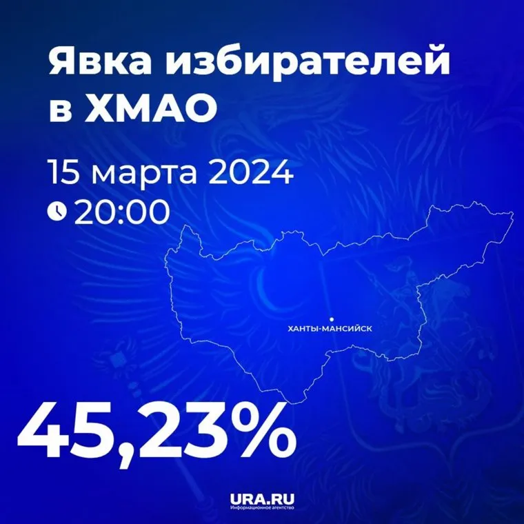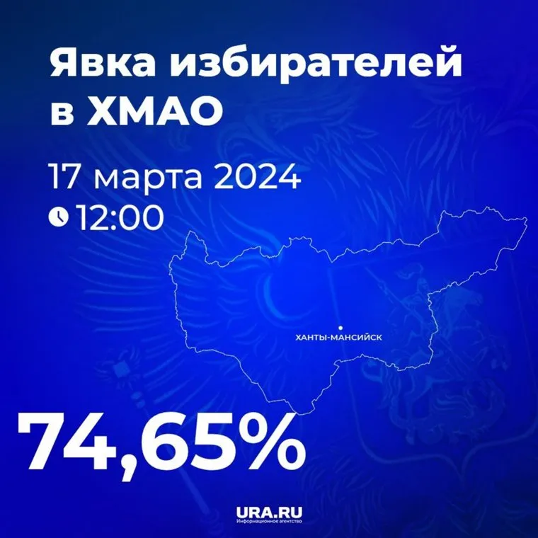 12:39 На выборах президента Российской Федерации в ХМАО проголосовало 74,65% (843 040 человек) от общего количества избирателей региона, по состоянию на 12:00, говорится в telegram-канале окружного избиркома.
