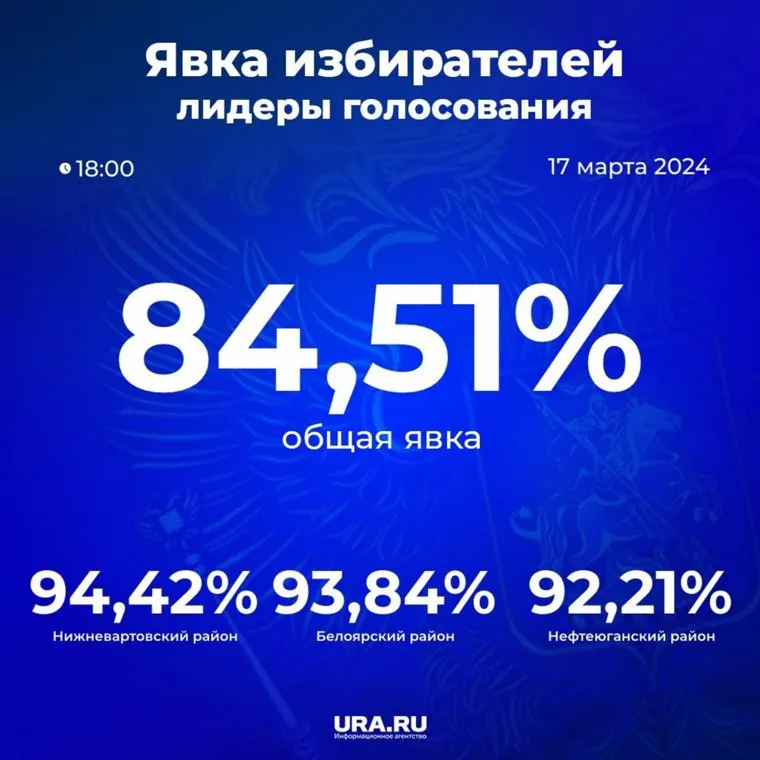 18:30 В Югре на выборах президента Российской Федерации проголосовали 84,51% избирателей, по состоянию на 18:00 17 марта. Это 955 485 человек, сообщает telegram-канал окружного избиркома.