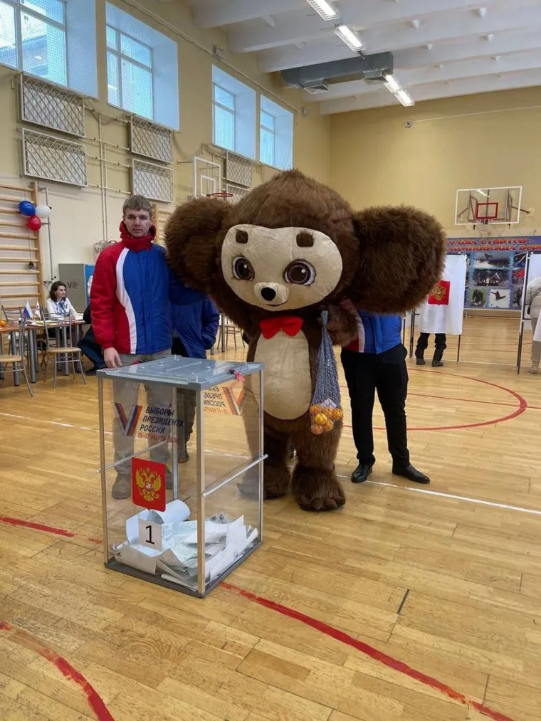 На избирательный участок в Югорске (ХМАО) местный житель пришел в костюме Чебурашки. Он проголосовал на выборах президента России и угощал югорчан апельсинами.