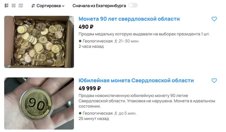 "Продам новоиспеченную юбилейную монету 90-летие Свердловской области. Упаковка не нарушена, монета в идеальном состоянии", — пишет автор объявления, оценивший свою монету в 49999 рублей. Другой пользователь готов избавиться от подарка за 499 рублей.