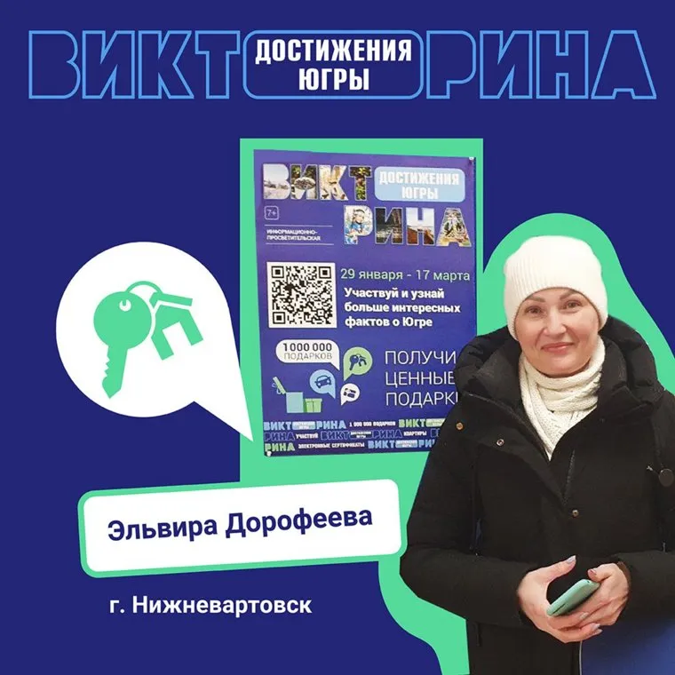 «Эльвира Дорофеева из Нижневартовска получила квартиру! Вот такой подарок от Викторины „Достижения Югры“. Эльвира работает оператором обезвоживающих и обессоливающих установок нефтегазодобывающего предприятия (специалист нефтегазовой отрасли, который контролирует технологический процесс выведения лишней воды и соли из нефти — прим. URA.RU)», — рассказали о победителе в telegram-канале властей ХМАО.