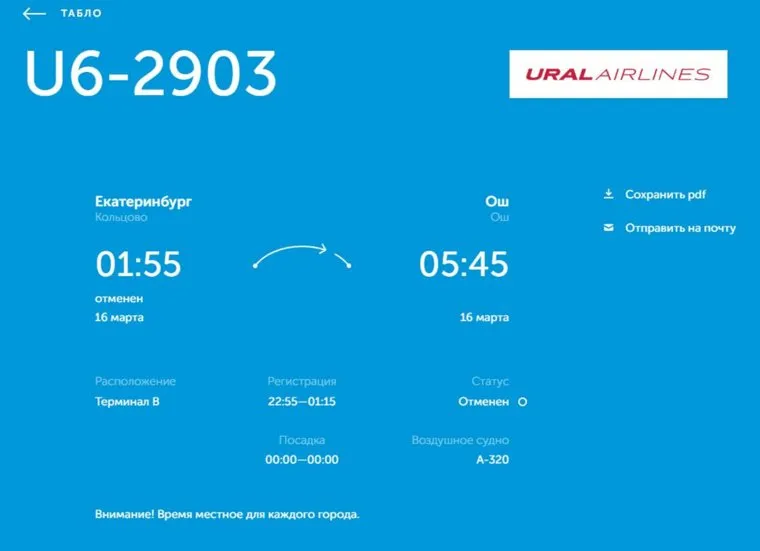 «Вылет воздушного судна А-320 из Екатеринбурга в Ош должен был состояться 16 марта в 01:55 по местному времени. Прибытие планировалось на 05:45 того же дня. Рейс отменен», — указано на сайте Кольцово.