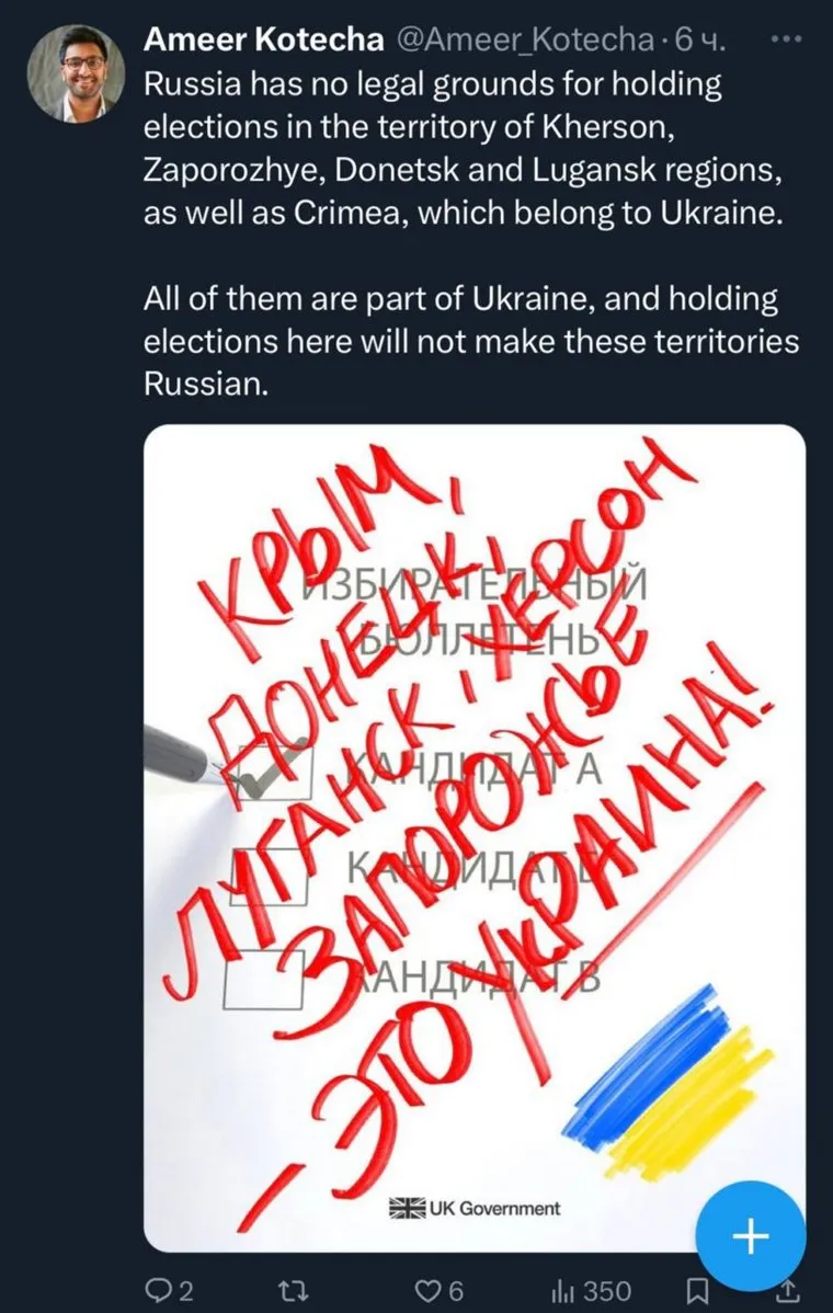 Генконсул Великобритании в Екатеринбурге Амир Котеча заявил, что Крым и Донбасс принадлежат Украине. Такое мнение дипломат озвучил в социальной сети X (бывший Твиттер).