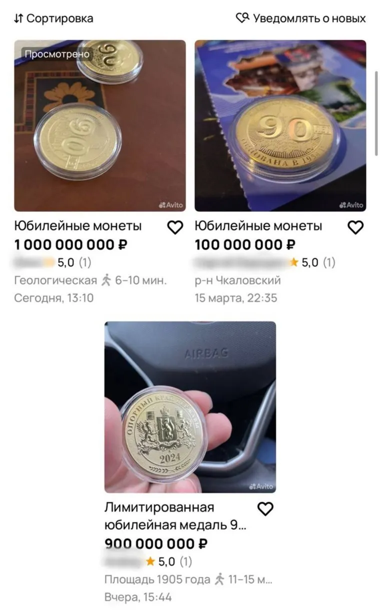 В одном из объявлений цена за медаль — два миллиарда рублей. Другой пользователь готов продать сувенир за один миллиард. Корреспонденту URA.RU автор этого объявления рассказал, что такую цену поставил из-за «небольшого тиража» и «уникальности» медали.