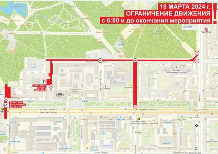 «Сегодня, 18 марта, ограничено движение транспорта по улице Коммуны от улицы Энгельса до Институтского переулка 2-го и по улице Энтузиастов от улицы Коммуны до проспекта Ленина. Также до окончания мероприятия ограничен въезд на парковки у памятника И. В. Курчатову и на 2-м институтском переулке», — сообщает telegram-канал мэрии.