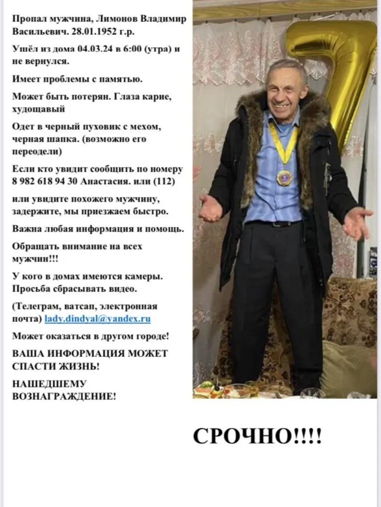 Пенсионер может находиться в другом городе. Если вы видели Владимира или знаете, где он находится, сообщите по номеру 8 (982) 618-94-30 (Анастасия) или по телефону 112.