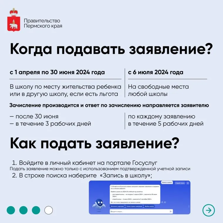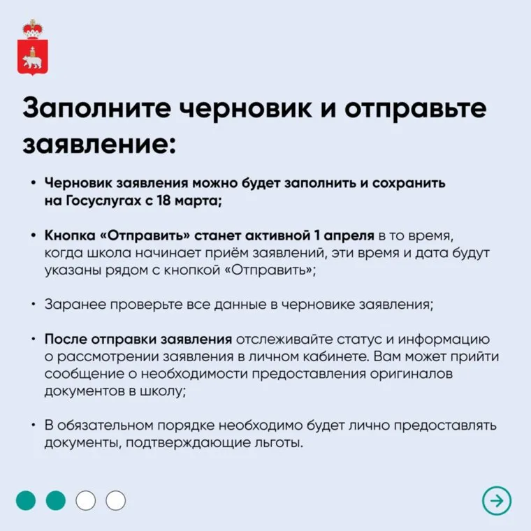 Школы Пермского края с апреля будут принимать заявления о приеме детей в первые классы. Подать документы можно не только лично, но и через Госуслуги. При этом, как отмечают в министерстве образования Прикамья, создать черновик заявления, чтобы 1 апреля мгновенно отправить его в школу, можно уже сейчас.