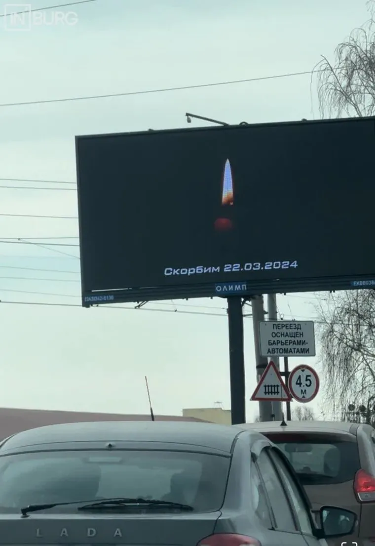 В Екатеринбурге 23 марта на рекламных билбордах и экранах появились изображения свечей в память о погибших во время теракта в «Крокус Сити Холле» в Подмосковье 22 марта. Внимание на это обратил читатель URA.RU. «Скорбим 22.03.2024», — гласит надпись на экранах.