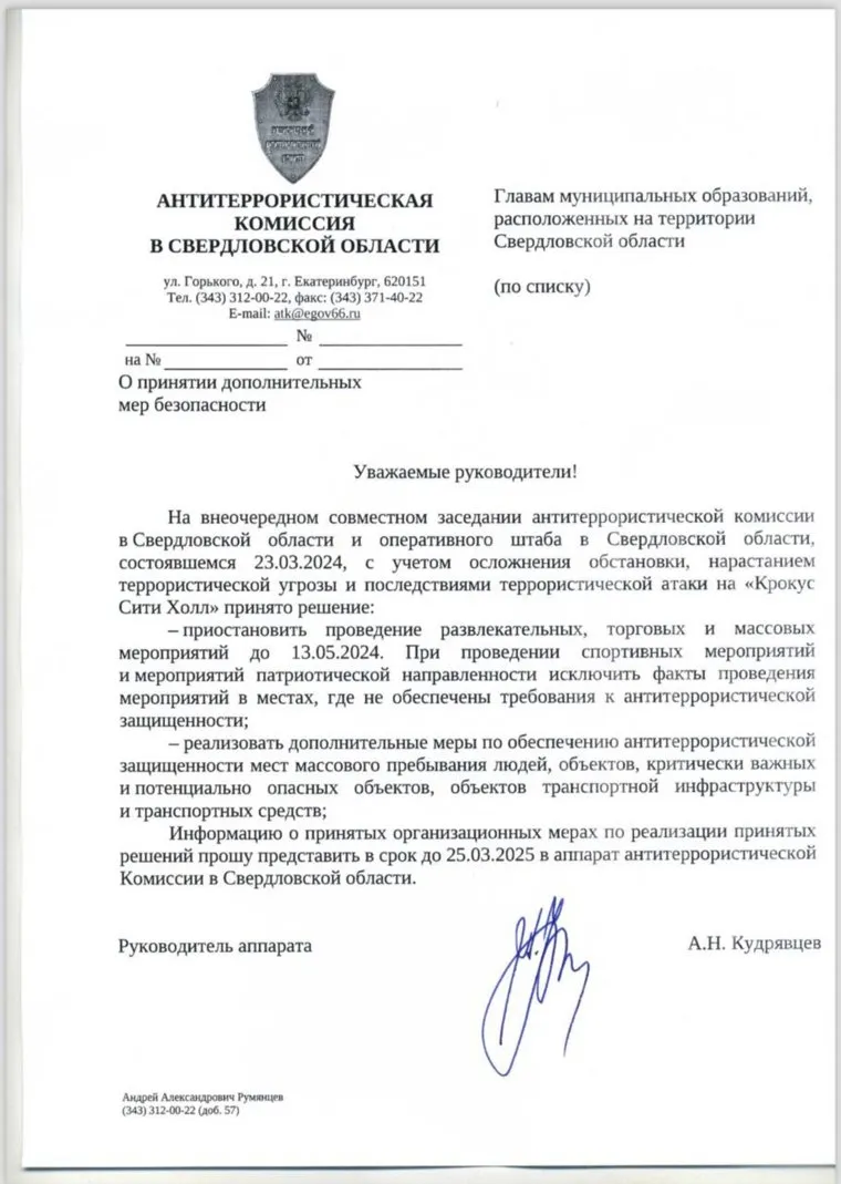 «На внеочередном совместном заседании антитеррористической комиссии в Свердловской области и оперативного штаба… принято решение приостановить проведение развлекательных, торговых и массовых мероприятий до 13.05.2024», — говорится в документе. Будут приняты меры дополнительной антитеррористической защиты в местах массового пребывания людей. Кроме того, власти усилят защиту важных и потенциально опасных объектов, вокзалов, аэропортов и транспорта.