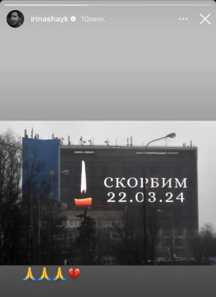 «Скорбим. 22.03.2024», — написала Ирина Шейк на своей странице в Instagram (принадлежит компании Meta, признанной экстремистской и запрещенной в РФ). Фото со страницы модели разместил telegram-канал «