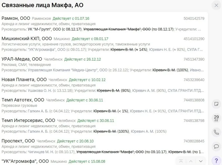 В холдинг семей Юревича входят не только предприятия пищевой индустрии, но также ТЦ «Алмаз», «Школьник» и «Родник», отель «Рэдиссон» в Челябинске, и 31 телеканал. Согласно сервису СБИС бизнес распределен между такими компаниями как: «Макфа», «Долговское», «Новая пятилетка», «Первый хлебокомбинат», «СМАК», «Арком», «Арктика-сервис», «Медиа-центр», «Мишкинский комбинат хлебопродуктов», «Новая планета», «Отельстрой», «Проспект», «Просторы», «Рамкон», «Родник». «Темп автотех». «Школьник», «Агромакфа». «М-групп», «Урал-Медиа». «Содействие», «Экспресс-Карго», «Эмитент Конасалтинг», «Каланчакский комбинат хлебопродуктов». Ко всем этим предприятиям, а также к кипрским, выставила претензии Генпрокуратура РФ .