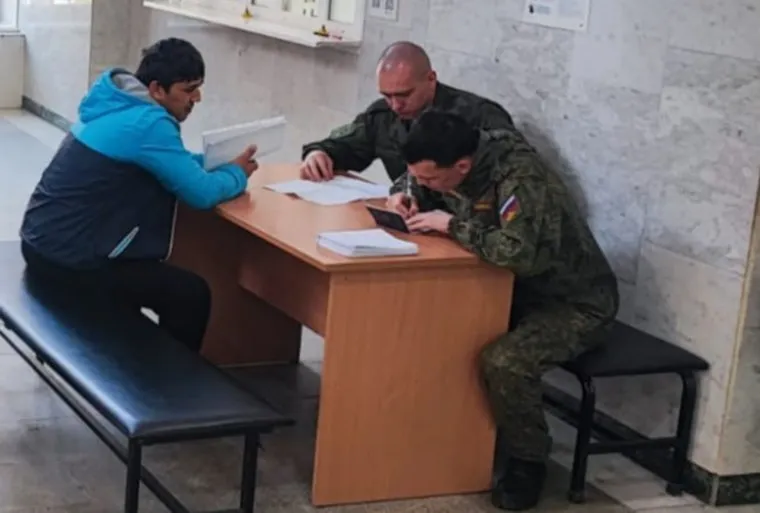 Военные раздают повестки мигрантам, столпившимся у ГИБДД в Екатеринбурге. Фото