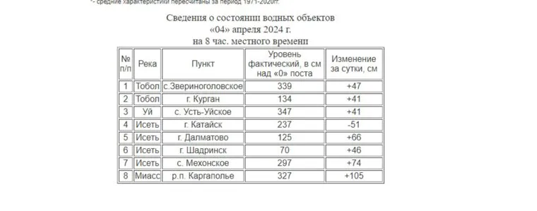 Сообщается, что Исеть также выросла в Шадринске и Далматово. По информации с сайта, показатели выросли на 46 и 66 сантиметров соответственно. При этом уровень Исети сократился в Катайске. По данным за 3 апреля, показатель достиг 237 сантиметров, что ниже на 51, чем день назад. Отмечается, что одинаковый прирост у рек Тобол в Кургане и Уй в Усть-Уйском — уровень обоих водоемов вырос на 41 сантиметр. Тобол также вырос в селе Звериноголовское. Там показатель вырос на 47 сантиметров и составил 339 над нулем гидропоста.