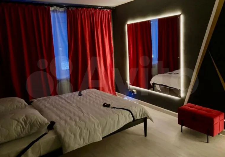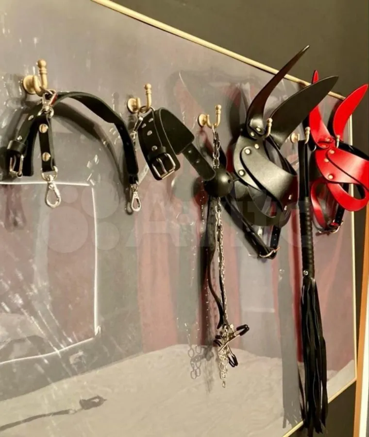 Владельцы поставили в квартире кровать с браслетами. Напротив нее на стене установлено большое зеркало. Также, согласно фото в объявлении, арендаторам предоставляют кожаную атрибутику для ролевых игр.