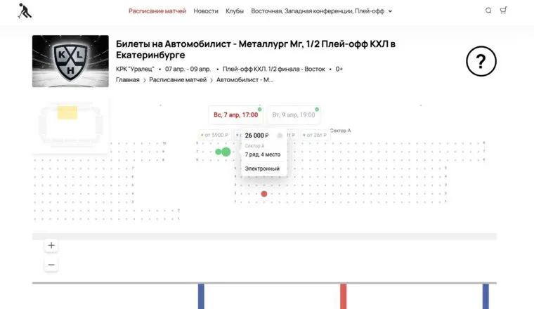 «На 7 апреля билеты от 5,9 тысячи рублей, это будет за воротами (сектор Л). Самое дорогое место находится в центральном секторе А на седьмом ряду — 26 тысяч рублей», — сказала URA.RU продавец.