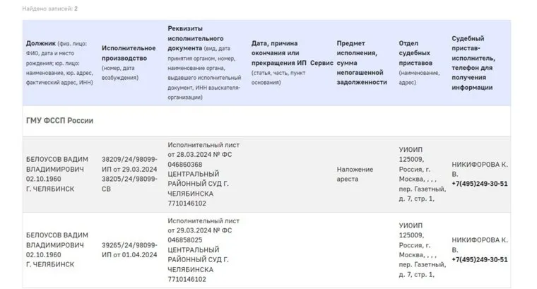После иска Генпрокуратуры о возврате холдинга «Макфа» государству, исполнительные производства по взысканию средств с Белоусова исчезли из базы данных. Вместо них открыты производства по аресту имущества и счетов объявленного в международный розыск политика. Такие же действия начаты ФССП в отношении членов его семьи, родственников челябинского экс-губернатора Михаила Юревича и их бизнес-партнеров.