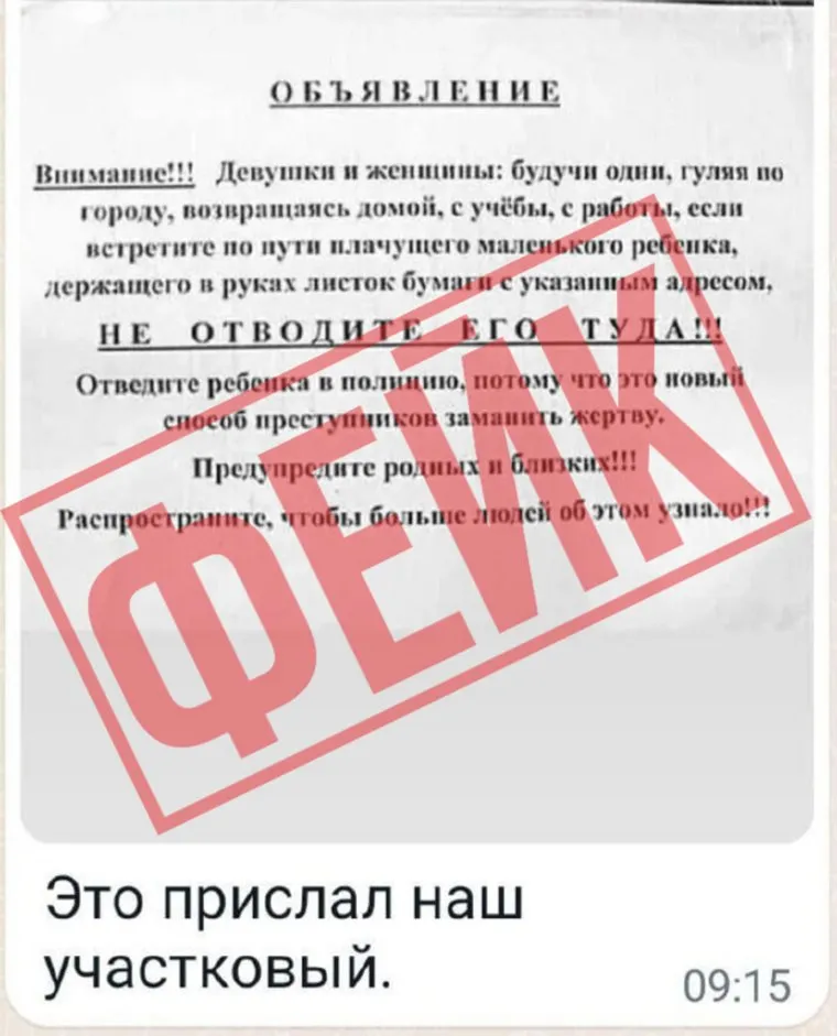 «Девушки и женщины, будучи одни, гуляя по городу, возвращаясь домой, с учебы, работы, если встретите по пути плачущего ребенка, держащего в руках листок бумаги с адресом, не отводите его туда!!! Отведите ребенка в полицию, потому что это новый способ преступников заманивать жертву», — говорится в распространяемом в социальных сетях и мессенджерах сообщении. На самом деле эти данные являются ложными. Этот фейк расходится в Интернете с 2015 года и не раз опровергался управлениями МВД в разных городах России.
