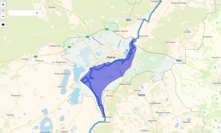 Зоны подтопления Кургана при критическом уровне повышения воды отмечены на карте. Ее опубликовал telegram-канал «РИА Новости» со ссылкой на геоинформационный портал Курганской области.