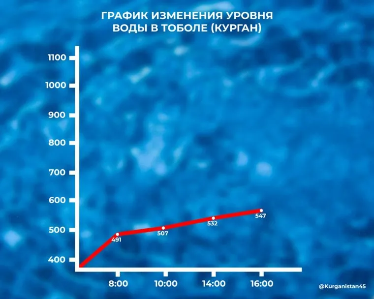 «Река Тобол. Уровень воды в 16:00: 547 сантиметров», — указано на портале. В восемь утра вода находилась на отметке 491 сантиметр над нулем поста. За последние два часа она поднялась на 15 сантиметров.