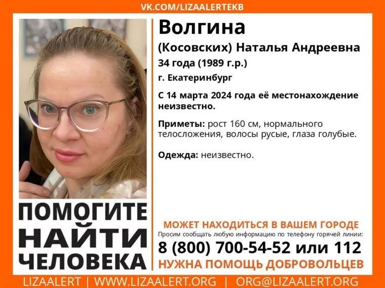 «Помогите найти человека! Пропала 34-лентяя Наталья Волгина (Косовских). С 14 марта 2024 года ее местонахождение неизвестно. Может находиться в вашем городе», — сообщают волонтеры в соцсети «ВКонтакте».