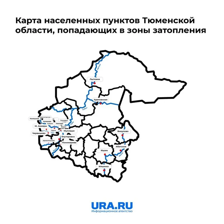 Согласно списку, составленному областными властями, в Тюменской области в первую очередь подтопление грозит населенным пунктам, расположенным у рек Ишим, Иртыш, Тобол, Пышма. Перечень разбит на районы и городские округи. К опасной зоне относятся: