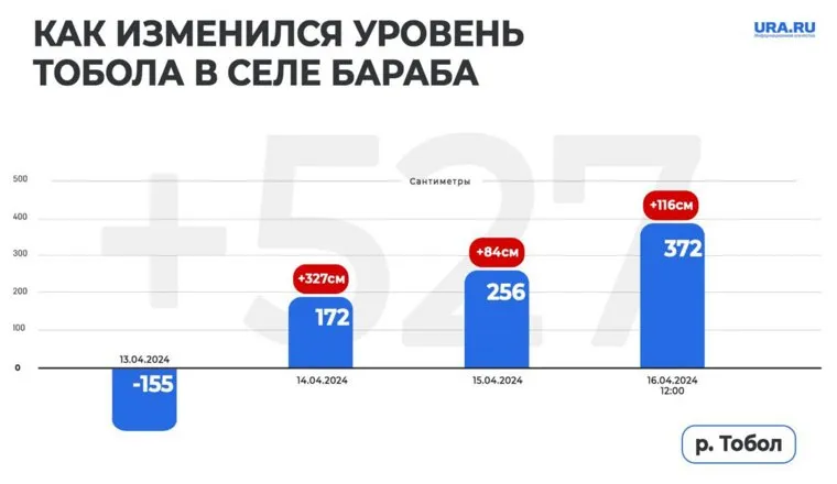 «На 14:00 14 апреля уровень воды в села Бараба был +172 см. При этом сутки назад отмечался уровень -155 см», — сообщал сайт «Паводок 2024» и местные жители. В 12:00 16 апреля уровень Тобола в курганском селе достиг отметки 372 см.
