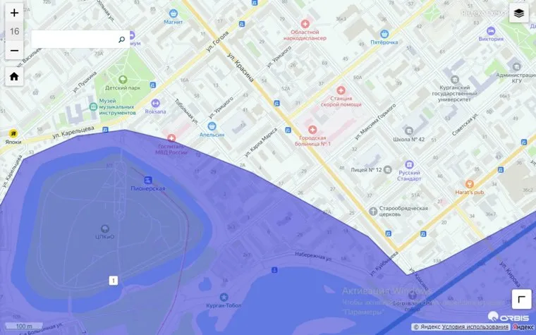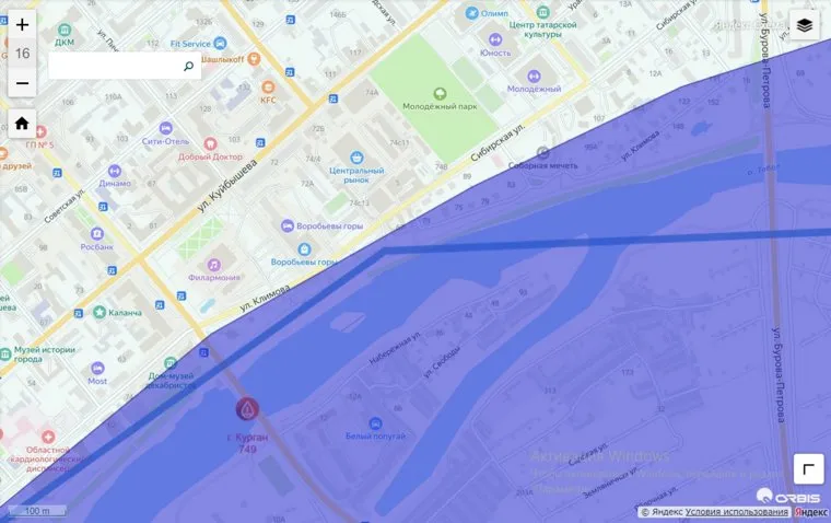 «На левом берегу Тобола указано, что в центре Кургана зона подтопления начинается с территории ЦПКиО (старица Битевка и окрестности) и заканчивается возле улицы Бурова-Петрова, но не уходит севернее за пределы улицы Куйбышева», — содержится в данных портала.