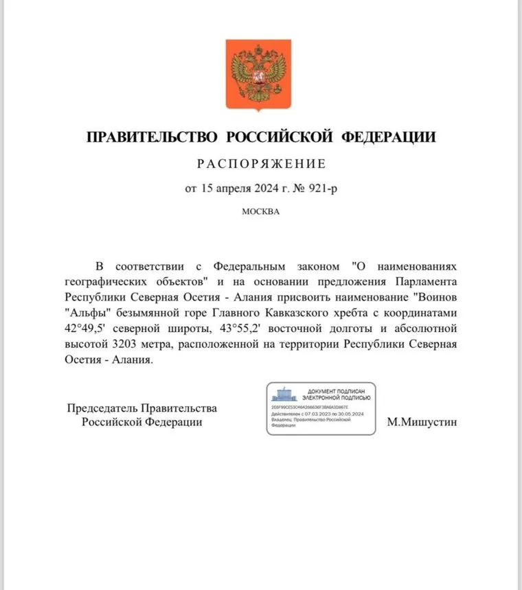 Свердловский сенатор Виктор Шептий поделился радостью: премьер-министр РФ Михаил Мишустин назвал одну из вершин Главного Кавказского хребта в честь спецотряда ФСБ «Альфа». Шептий, служивший в подразделении в 1990-е годы, опубликовал соответствующее распоряжение в своих соцсетях.