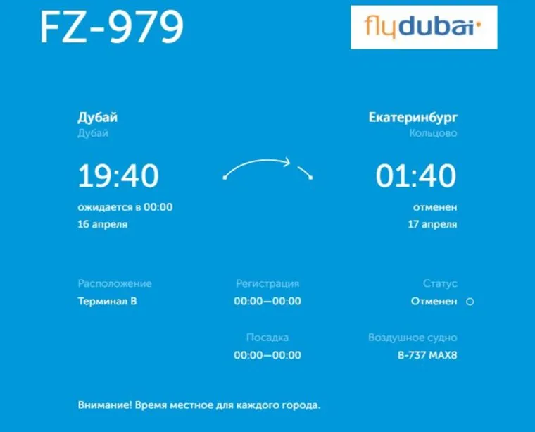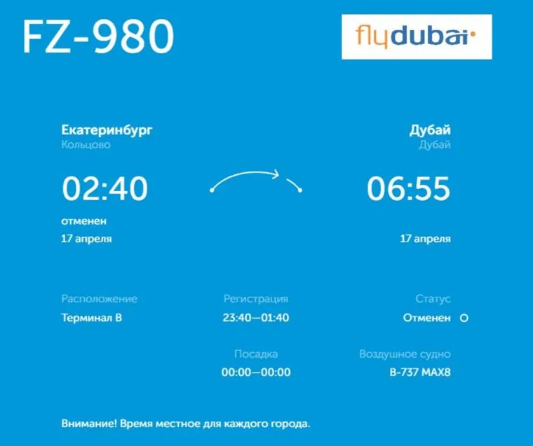 «Рейс FZ-979 авиакомпании Fludubai отменен. Судно B-737 MAX8 должно было вылететь из Дубая в 00:00 и приземлиться в аэропорту Кольцово в Екатеринбурге в 01:40. Рейс отменен», — следует из онлайн-табло. Также отменен обратный рейс из Екатеринбурга в Дубай.