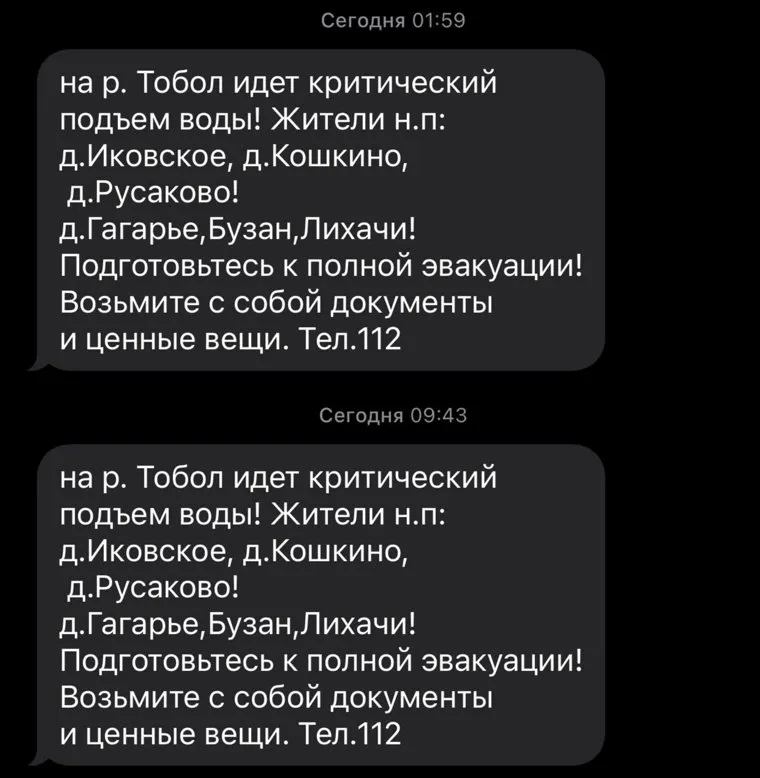 «На реку Тобол идет критический подъем воды! Жители населенных пунктов: деревни Иковское, Кошкино, Русаково, Гагарье, Бузан, Лихачи! Подготовьтесь к полной эвакуации! Возьмите с собой документы и ценные вещи», — передает собеседник сообщение от RSCHS.