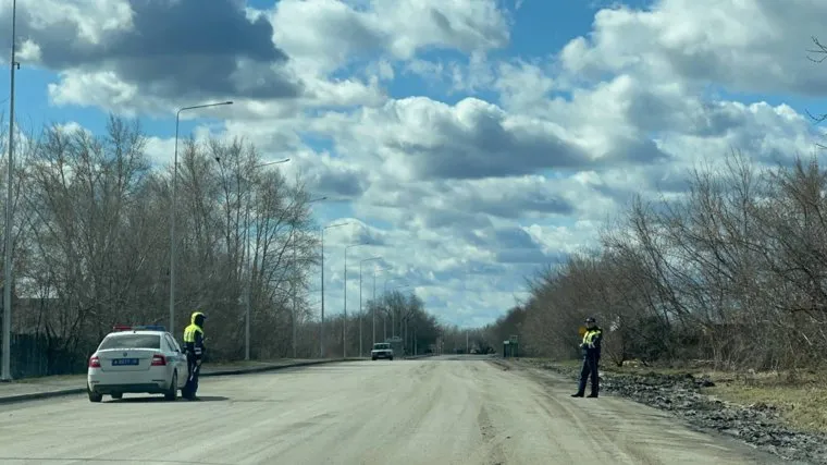 На перекрытой улице, ведущей к аэропорту Кургана стоят посты ДПС