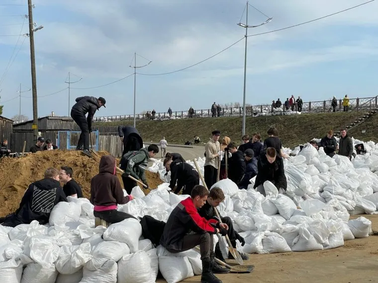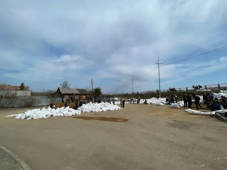Волонтеры в Кургане продолжают укреплять дамбу 18 апреля. Вода в Тоболе при этом прирастет каждые два часа