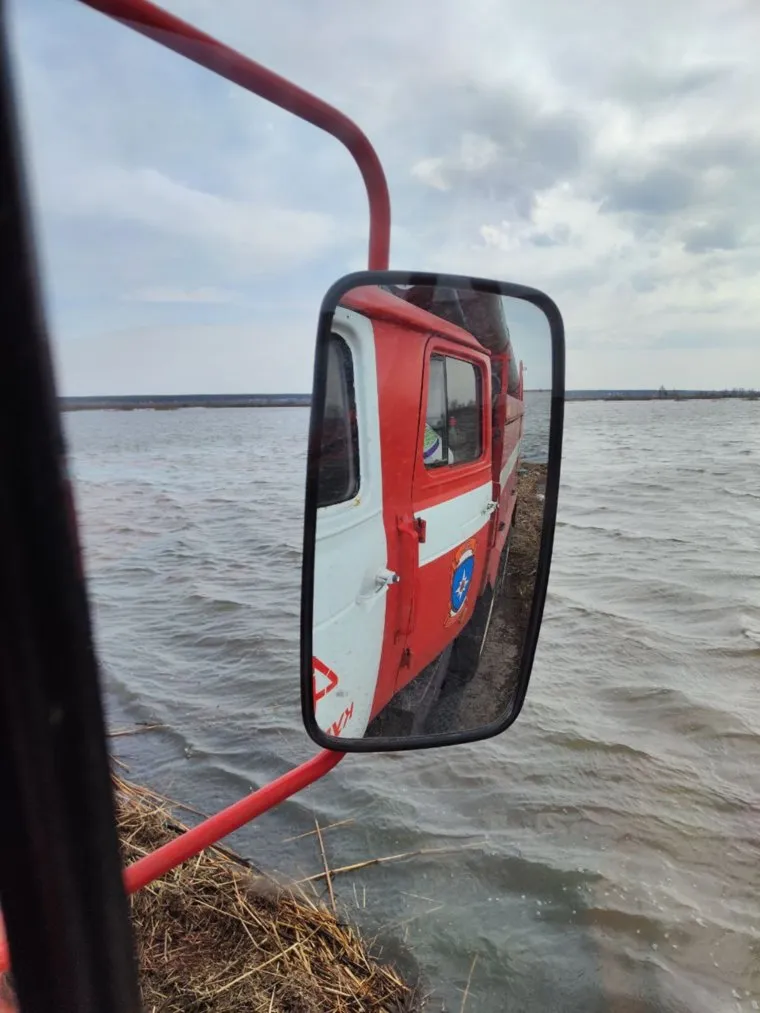 Из окон спецтранспорта видно, как затоплена территория, которая недавно была сухой