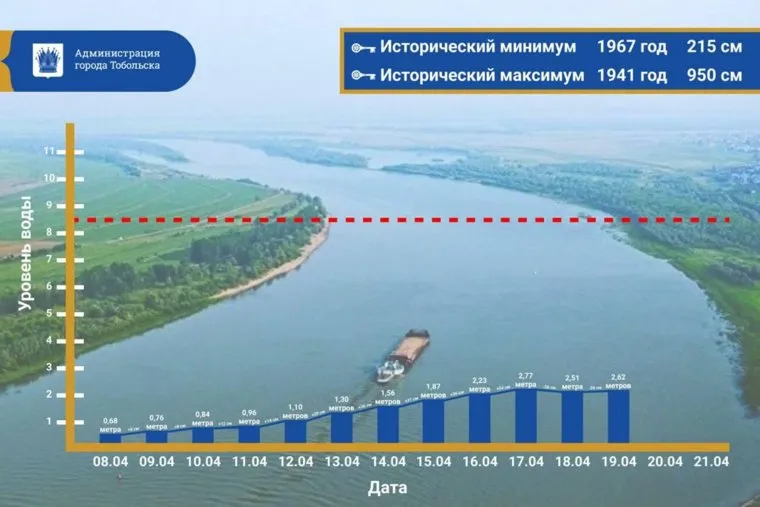 10:27 Мэр Тобольска Максим Афанасьев опубликовал последние данные по уровню воды в реке Иртыш. На 19 апреля уровень воды составляет 262 см.