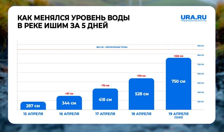 Уровень воды в реке Ишим на контрольной точке в Ишиме с понедельника 15 апреля и до 12:00 19 апреля вырос на 463 сантиметра, составив 750 сантиметров. Это следует из данных, публикуемых информационным центром правительства Тюменской области.