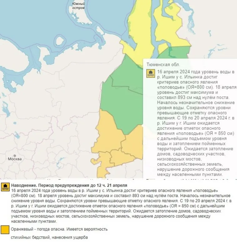«С 19 по 20 апреля в реке Ишим у города Ишима ожидается достижение отметок опасного явления „половодье“ (ОЯ = 850 см), с дальнейшим подъемом уровня воды и затоплением пойменных территорий. Ожидается затопление домов, садоводческих участков, низководных мостов, сельскохозяйственных земель, нарушение дорожного сообщения между населенными пунктами», — сообщают метеорологи.