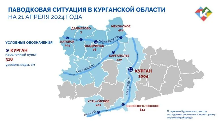 «Сведения о состоянии водных объектов на 21 апреля. Фактический уровень воды в реке Миасс в рабочем поселке Каргаполье — 220 см (-16 см за сутки). Река Тобол в Барабе — 353 см (-14 см), река Исеть в Далматово — 3 см (-11 см)», — указано в данных МЧС на 8:00 21 апреля. В селе Звериноголовское на Тоболе на это время уровень воды составил 844 см (-10 см за сутки).