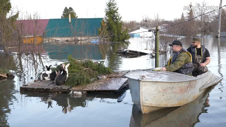 12:31 Житель затопленного СНТ под Курганом соорудил для своих кроликов . На нем животных подкармливают и защищают от воды. Отмечается, что плот закреплен, чтобы кроликов не унесло течение.