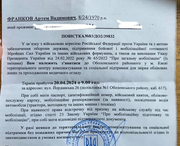 Украинцев призывают на службу даже после их смерти. Недавно повестка пришла главному редактору журнала «Футбол» Артему Франкову, который умер осенью 2023 года.