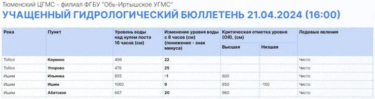 17:10 Информация об уровне воды в реках Тюменской области на 16:00 21 апреля