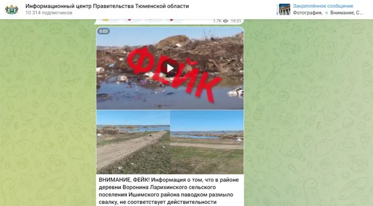 22 апреля журналисты URA.RU сняли свалку у деревни Воронина. Ее начала размывать вода, и непонятно, сколько мусора уже успело унести течение. Вечером того же дня в инфоцентре правительства Тюменской области вышло опровержение информации. Со слов главы Ларихинского сельского поселения Татьяны Нененко репортаж корреспондентов назвали фейком.