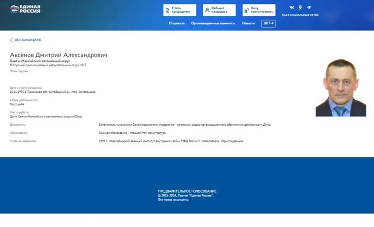 «Аксенов Дмитрий Александрович. Ханты-Мансийский автономный округ, Югорский одномандатный избирательный округ № 2. Член партии», — указано на сайте.